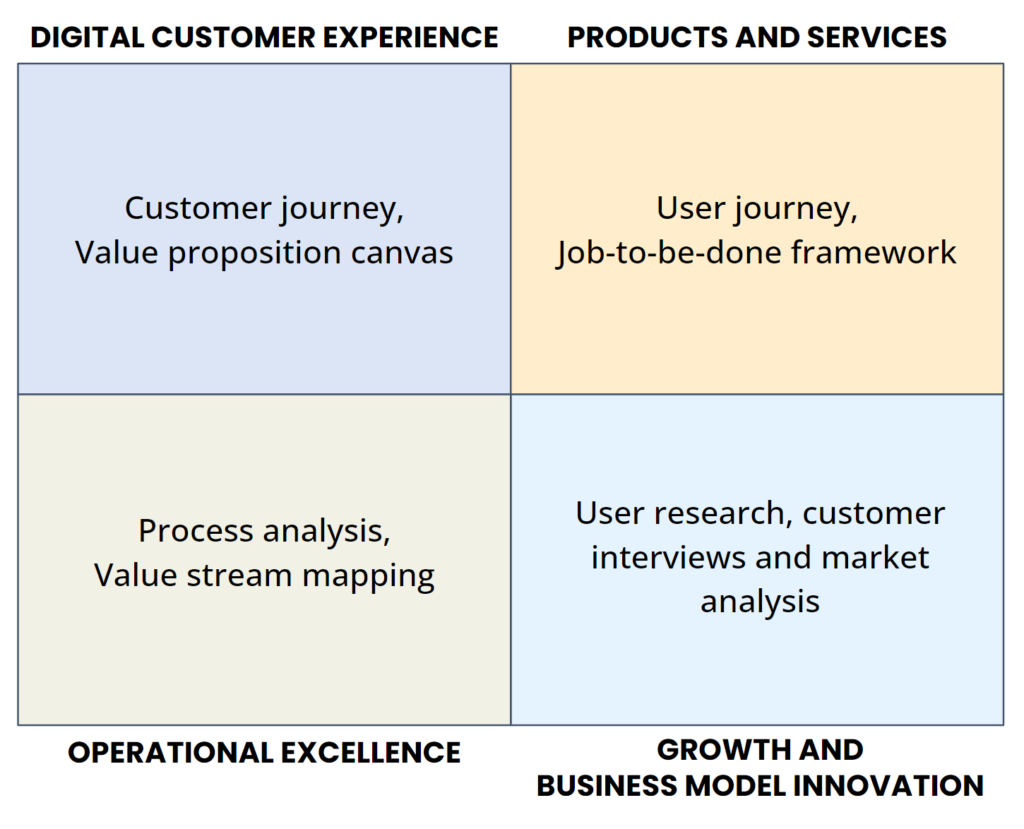 In general, there are several methodologies for identifying AI opportunities. As a starting point, we typically use the following quadrant that applies to different industries relatively well, although the perspectives need to be revisited sometimes. For clarity, we also collected examples of potential methodologies useful in these areas.