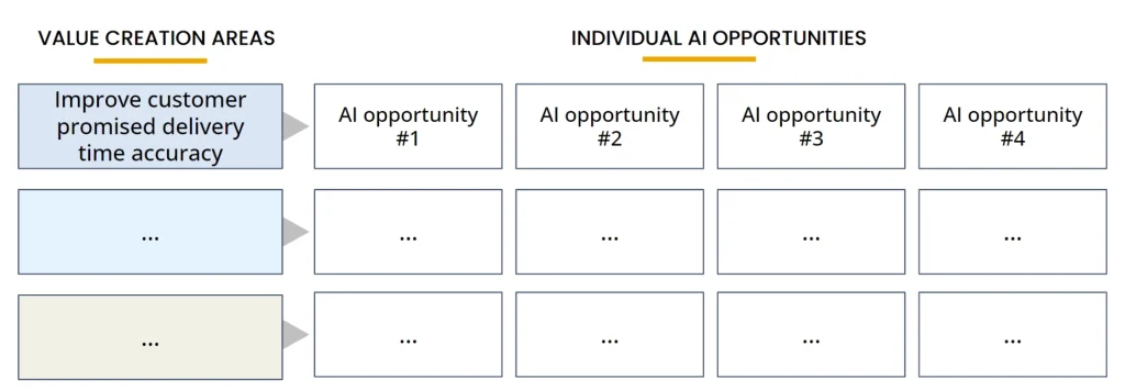 In our example, we further categorized the AI opportunities into three value-creation areas linked to the client’s business strategy and objectives. Later each area was assigned the four most promising AI opportunities. The key is that selected AI opportunities can contribute significantly to the success of the value-creation area in question.